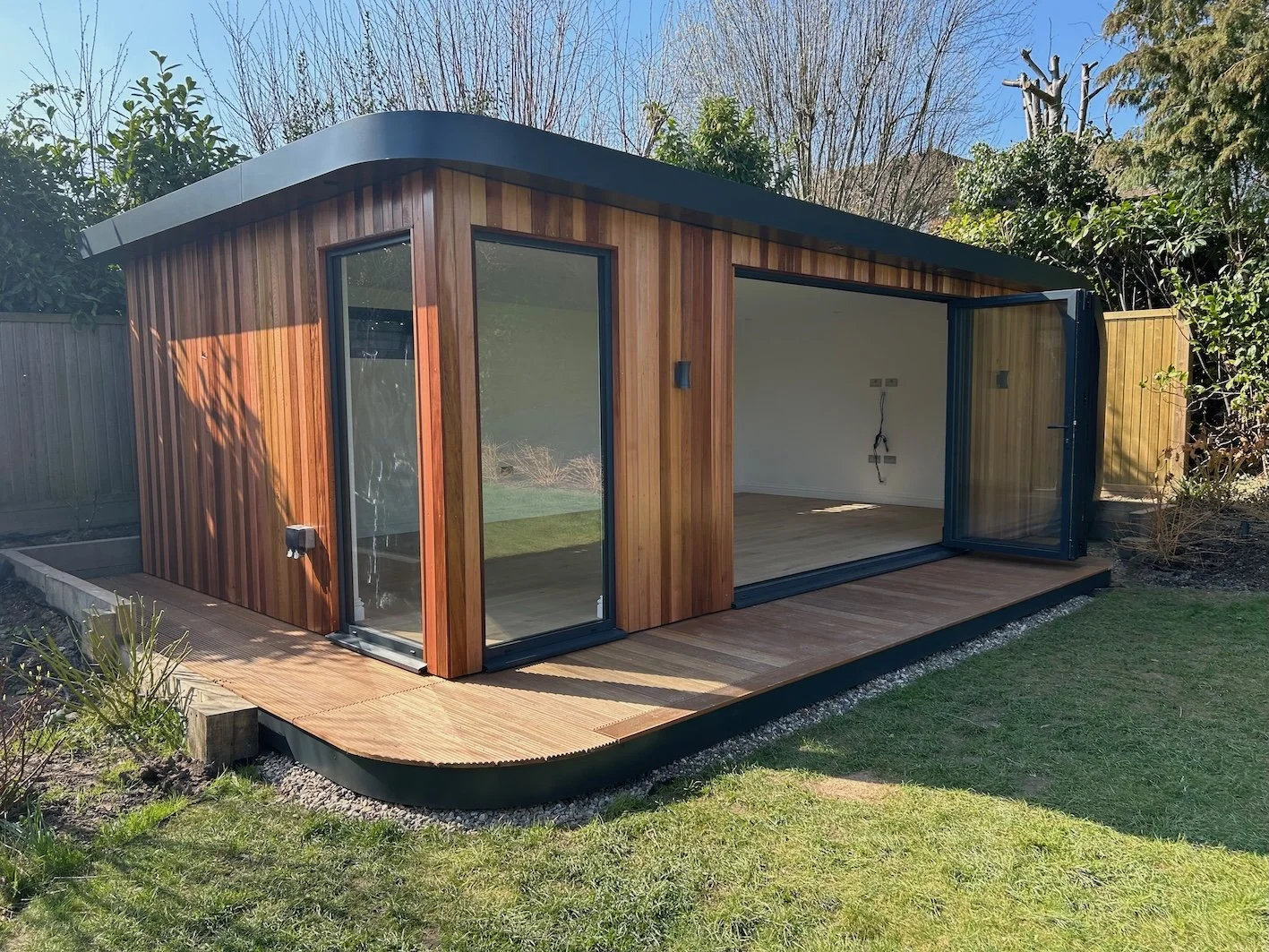 At Curve we pay great attention to details and finish: our rooms are crafted using the best materials. They are fully insulated (40mm floor, 75mm walls and roof) to benefit from the programmable underfloor heating, have full customisable electrics and home internet connection with WiFi, 14mm engineered real hardwood flooring (not cheap laminate like most others), 24mm double glazed aluminium windows and doors, fully finished interiors (painted or wallpapered), and western red cedar cladding. All features are customised to your needs ensuring the finished structure is of the highest standard, to your taste, and providing extremely good value for money.