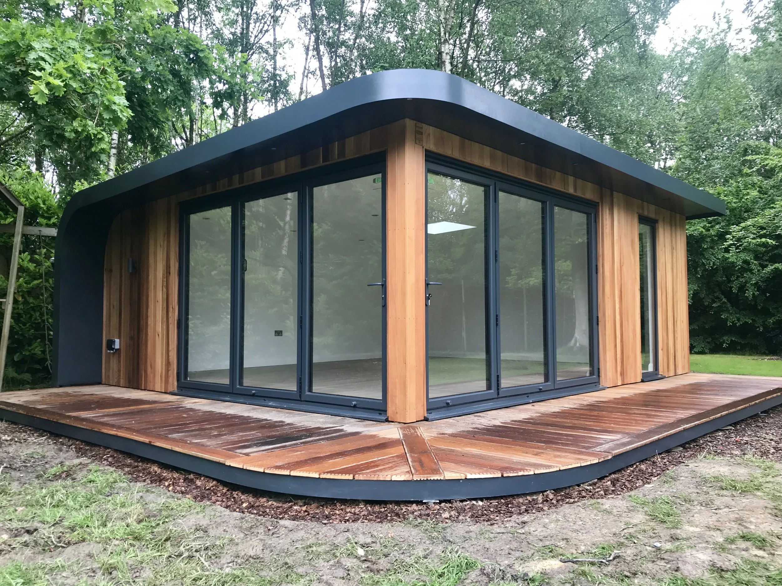 At Curve we pay great attention to details and finish: our rooms are crafted using the best materials. They are fully insulated (40mm floor, 75mm walls and roof) to benefit from the programmable underfloor heating, have full customisable electrics and home internet connection with WiFi, 14mm engineered real hardwood flooring (not cheap laminate like most others), 24mm double glazed aluminium windows and doors, fully finished interiors (painted or wallpapered), and western red cedar cladding. All features are customised to your needs ensuring the finished structure is of the highest standard, to your taste, and providing extremely good value for money.